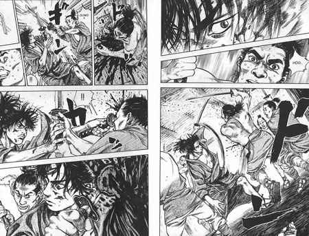 Narrativement aussi, Takehiko Inoue se permet des audaces rares dans le manga : il abandonne ainsi son héros, Musashi Miyamoto, des volumes 14 à 20, pour raconter la vie d’un autre personnage, Kojiro Sasaki, rival historique de Musashi. Mais le mangaka en fait un enfant sourd et muet, et l’histoire s’en trouve changée.